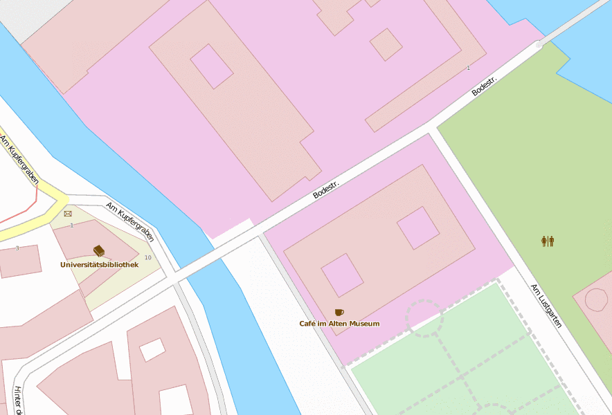 Nicht weit entfernt sind beliebte Orten wie Neues Museum, Museumsinsel oder Altes Museum. Passend sind auch die folgenden Stadtpläne: Sanssouci, Brandenburger Tor, Schloss Charlottenburg und Rotes Rathaus